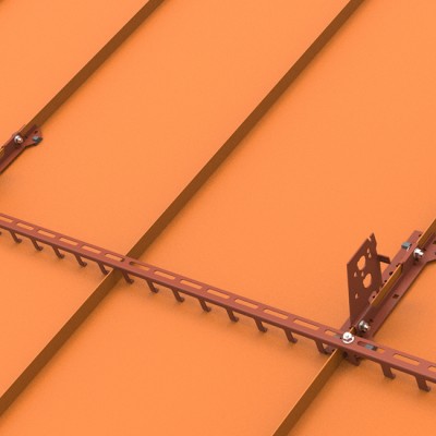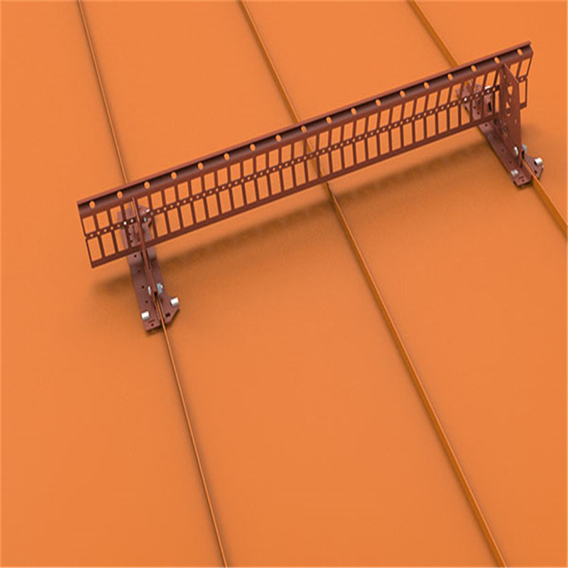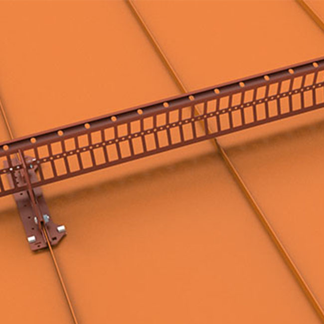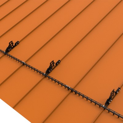 金属屋面用的挡雪栅栏具有特殊的底部构件,使整套装置匹配金属屋顶瓦面。